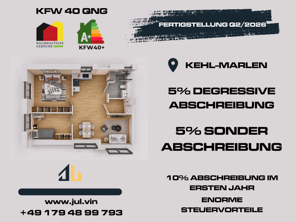 Die Beispielrechnung zeigt: Eine Immobilie mit KfW 40 QNG Standard ist nicht nur ökologisch sinnvoll, sondern auch finanziell attraktiv. Durch die Kombination von Mieteinnahmen, steuerlichen Abschreibungsmöglichkeiten und Steuerersparnissen lässt sich selbst bei einem anfänglich negativen Cashflow eine hohe Rendite erzielen.