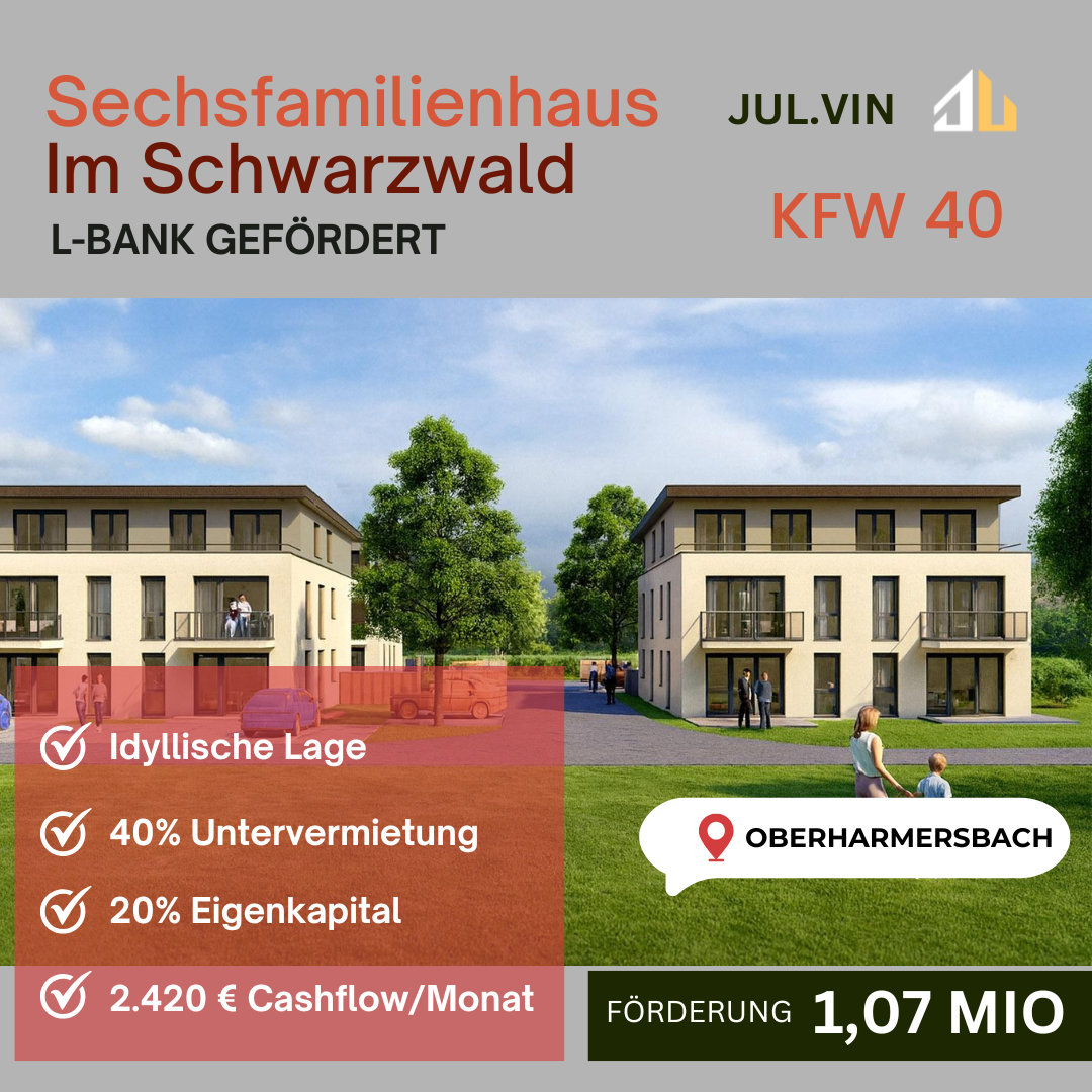 Willkommen bei einem außergewöhnlichen Immobilienprojekt, das modernes Wohnen mit nachhaltiger Bauweise und attraktiven Fördermöglichkeiten verbindet! Die JUL.VIN GmbH freut sich, Ihnen ein neues Sechsfamilienhaus als Punkthaus in Oberharmersbach vorzustellen. Mit einem direkten Zuschuss von 1,07 Mio. € durch die L-Bank, einem positiven Cashflow von ca. 2.420 €/Monat und sicheren Mieteinnahmen vom Sozialamt bietet dieses Projekt eine einzigartige Gelegenheit für Investoren. Staatliche Förderung nutzen. Steuern sparen. Sichere Mieten sichern.